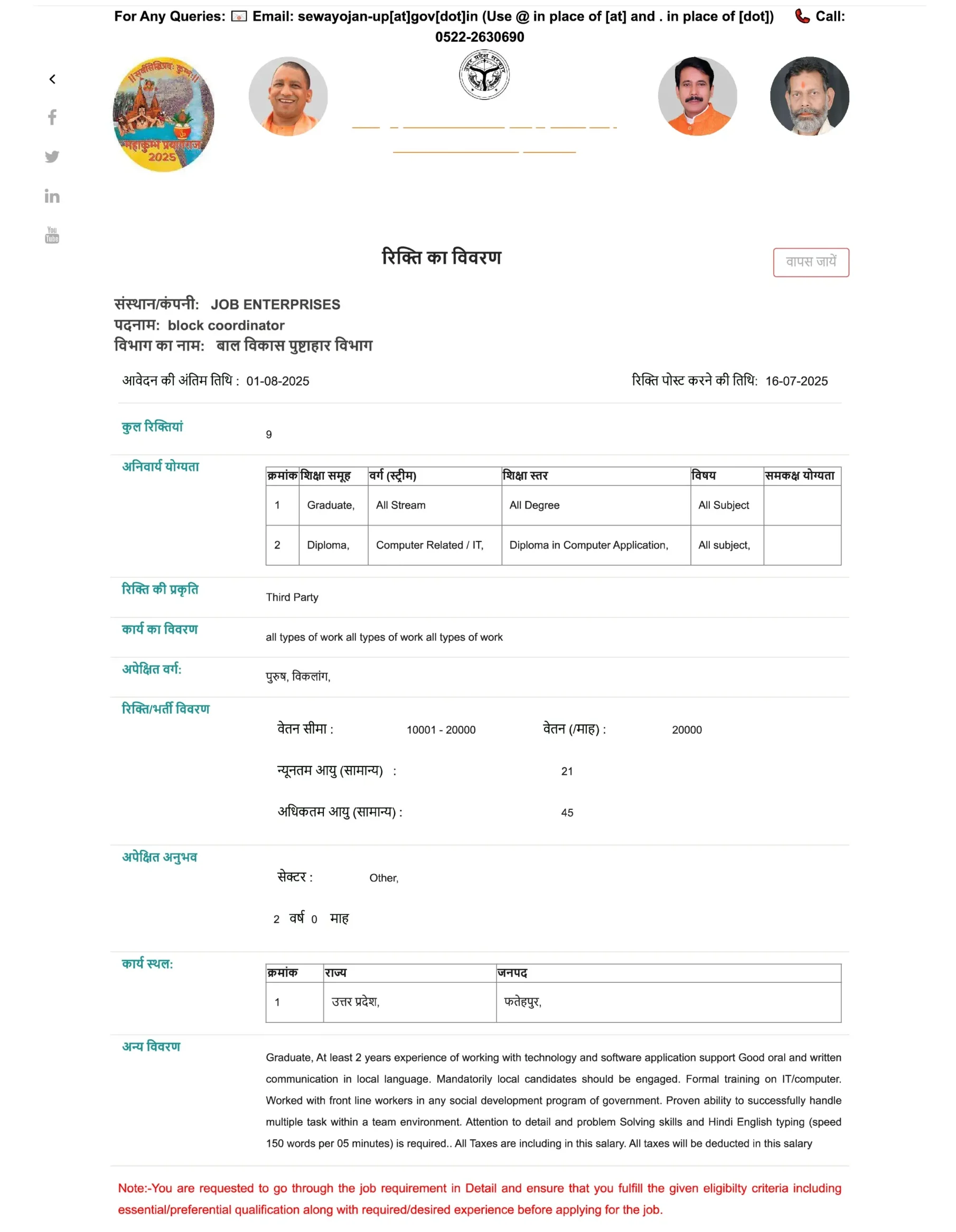 उत्तर प्रदेश के सरकारी विभाग में ब्लॉक कोऑर्डिनेटर पद पर भर्ती 2025 | फतेहपुर, उत्तर प्रदेश